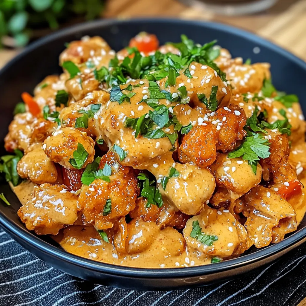 Richte die Bang Bang Hähnchenstücke auf einer Servierplatte oder einzelnen Tellern an. Beträufle sie mit der restlichen Sauce und streue frisch gehackte Petersilie darüber – das sorgt nicht nur für einen hübschen Farbkontrast, sondern bringt auch eine frische Note ins Spiel.