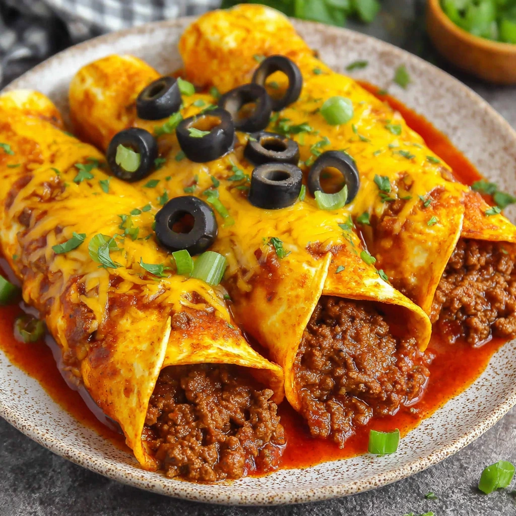 Diese saftigen Rindfleisch-Enchiladas mit geschmolzenem Cheddar-Käse, weichen Weizentortillas und würziger roter Enchilada-Sauce sind der Inbegriff mexikanisch-amerikanischer Comfort Food. Das zarte, gewürzte Rindfleisch wird in weiche Tortillas gerollt, mit einer reichhaltigen roten Sauce übergossen und mit Käse überbacken, bis alles goldbraun und sprudelnd ist. Diese herzhafte Mahlzeit ist perfekt für Familienabende, Potluck-Dinner oder wenn Sie Lust auf authentische Tex-Mex-Küche haben. Mit ihrer perfekten Balance aus würzigem Fleisch, cremigem Käse und pikanter Sauce werden diese Enchiladas schnell zu einem Lieblingsgericht in Ihrer Küche.