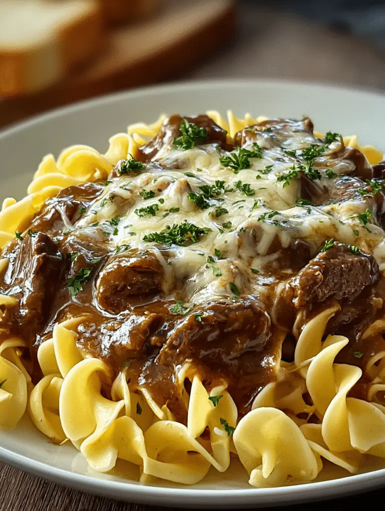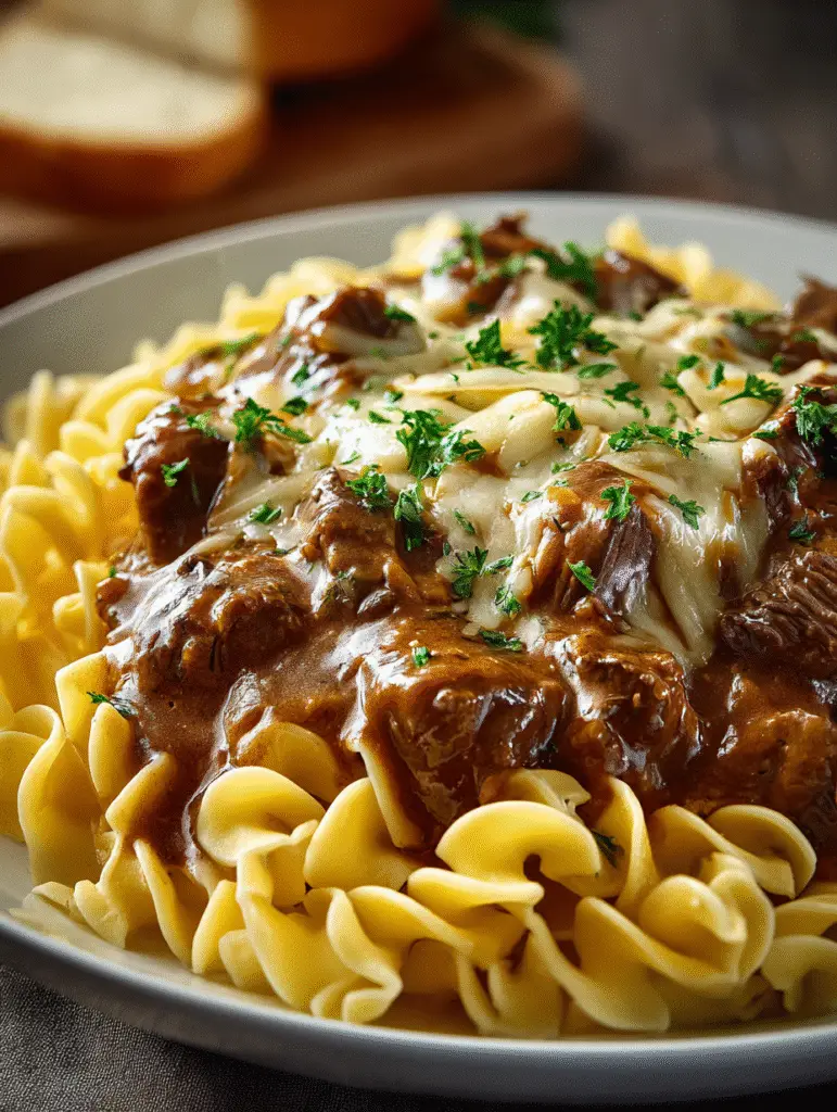 einen dampfenden Topf voller zarter Rindfleischstücke vor, die in einer cremigen Sauce mit karamellisierten Zwiebelnoten und würziger Brühe verschmelzen. Dazu breite Eiernudeln, die die aromatische Sauce perfekt aufnehmen – ein Gericht, das nach Wärme, Gemütlichkeit und Hausmannskost pur schmeckt.