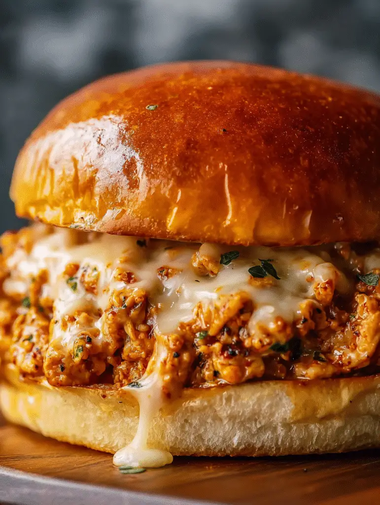 7. Sandwiches zusammenstellen: Die würzige Hähnchen-Mischung großzügig auf den unteren Brötchenhälften verteilen, mit Mozzarella und Cheddar bestreuen, und dann die obere Brötchenhälfte aufsetzen.