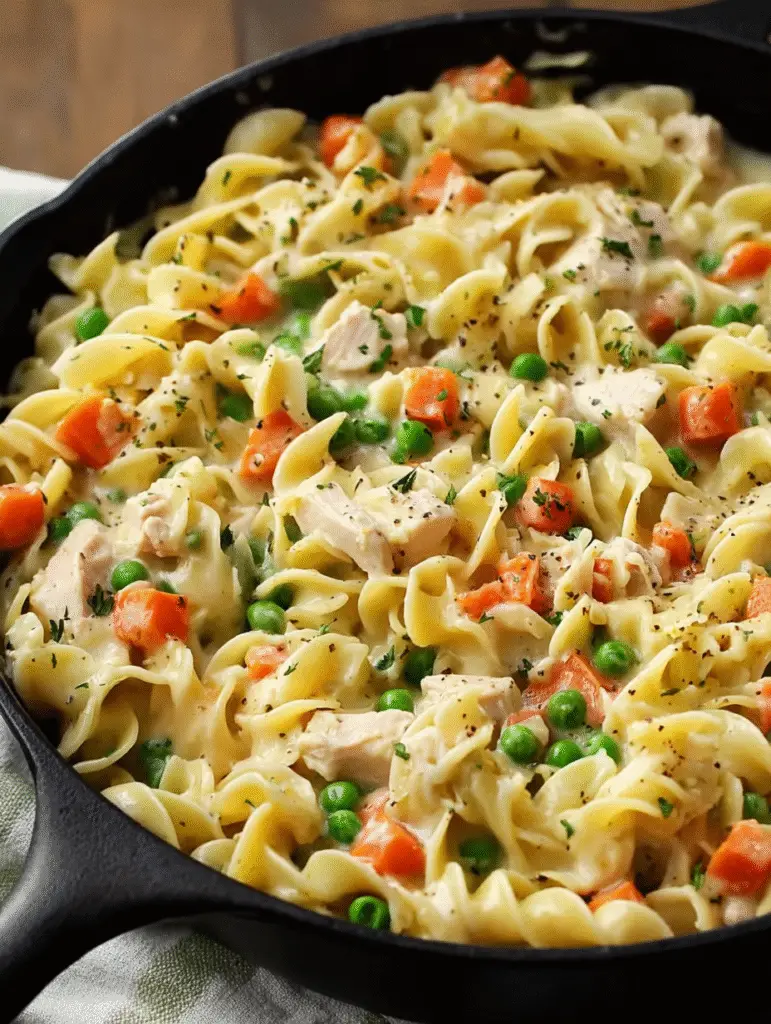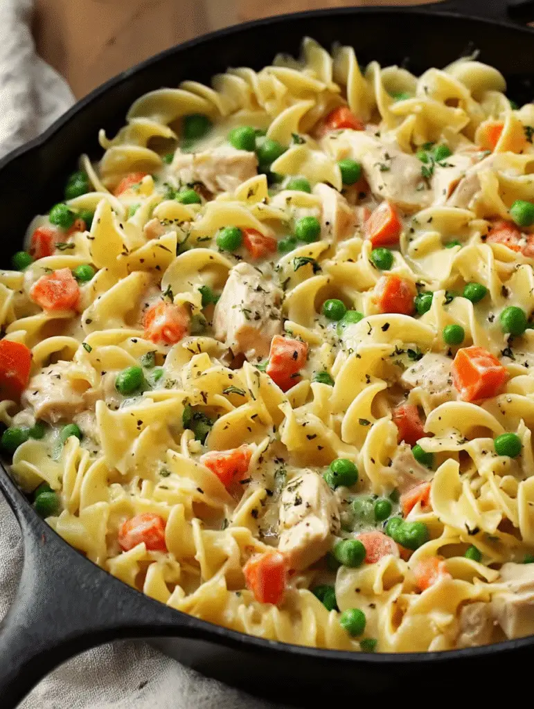 Die Aromen einer klassischen Chicken Pot Pie, aber statt einer Kruste findest du breiten Eiernudeln, die die cremige Sauce aufnehmen. Zartes Hähnchen, Erbsen und Karotten in einer samtigen Sahnsauce – alles in einer Pfanne. Ein herzhaftes, gemütliches Gericht, das nach Komfortküche schmeckt und doch schnell & unkompliziert gelingt.