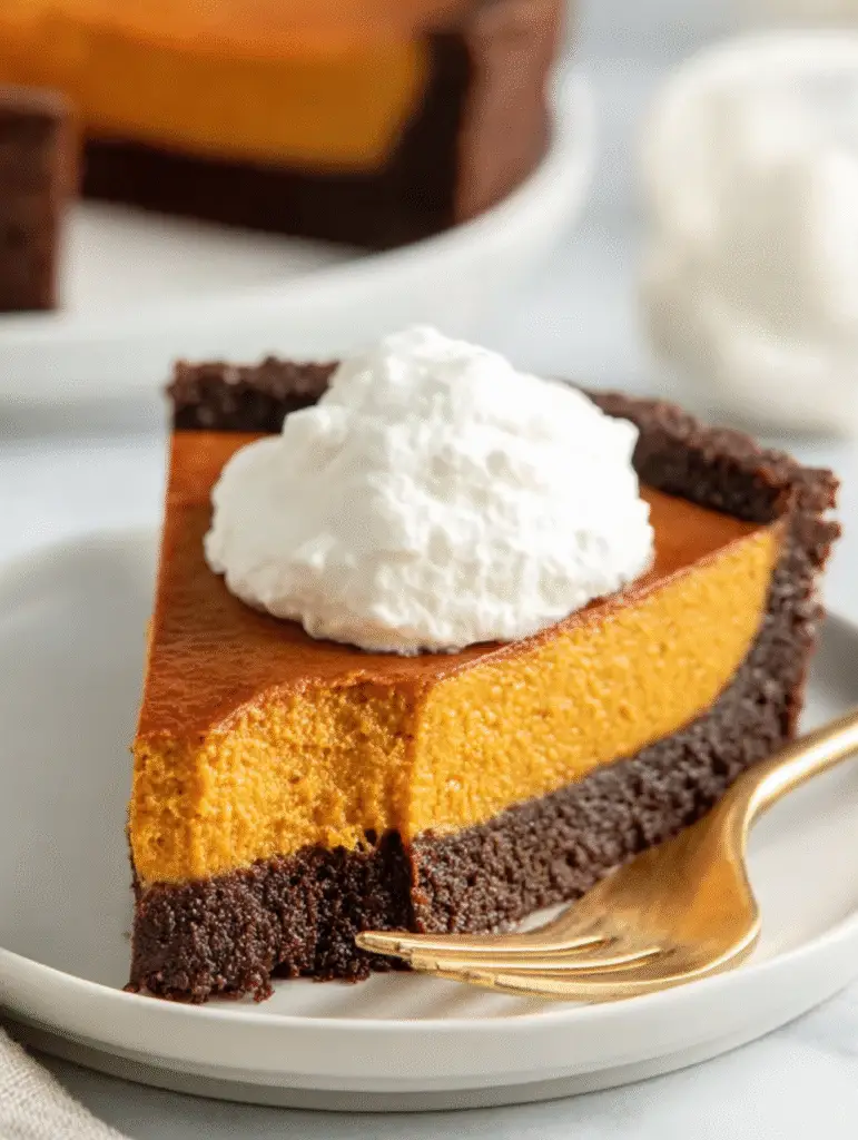 Die dunkle Schokoladenkruste bringt kräftigen Schoko‑Geschmack und ein bisschen Bitterkeit — sie balanciert so die Süße und Würze der Kürbisfüllung perfekt und ergibt mehr Tiefe.