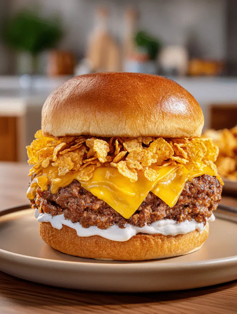 Untere Brötchenhälfte → Patty mit geschmolzenem Käse → optional extra zerbröselte Chips oder Lieblings-Toppings → obere Brötchenhälfte. Am besten sofort servieren — heiß, saftig und knusprig.