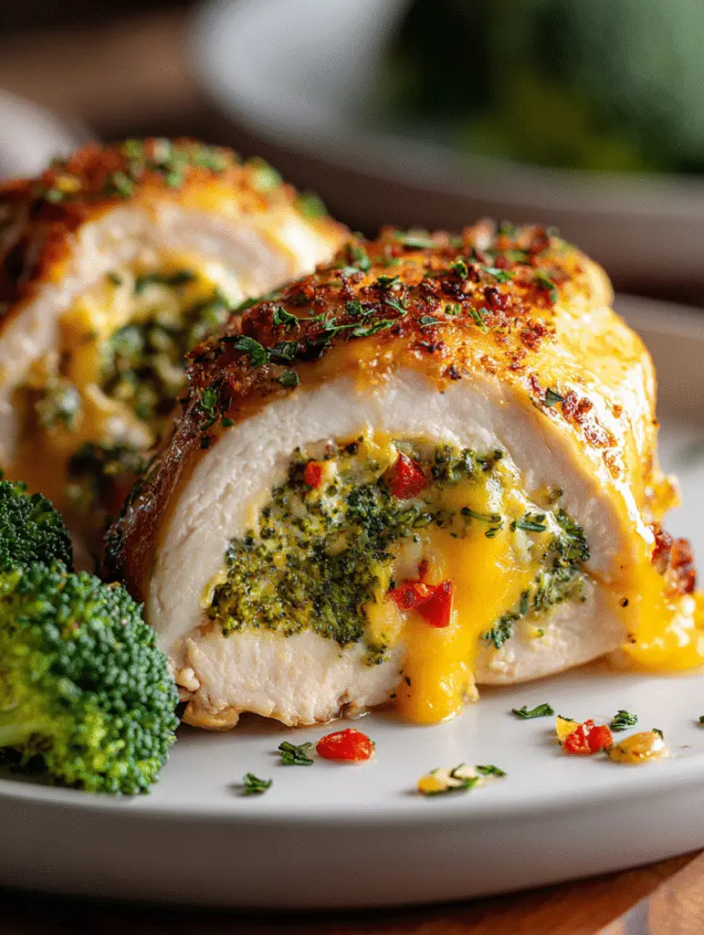 Hähnchenbrust vor, in die man eine cremige Füllung aus zartem Brokkoli, Frischkäse, und geschmolzenem Cheddar steckt. Beim Braten oder Backen verschmilzt alles zu einem herzhaften, gemütlichen Gericht – ideal für ein Familienessen oder ein gesundes Comfort-Food.