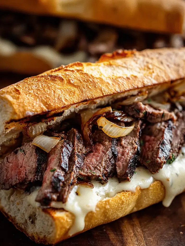 Dieses Sandwich bringt saftig gegrilltes oder gebratenes Steak zusammen mit aromatischem Knoblauch-Kräuter-Aufstrich, zart geschmolzenem Käse und frischem Brot zu einem wahren Genuss. Es ist ideal für ein reichhaltiges Mittag- oder Abendessen, wenn du Lust auf herzhaften Geschmack hast, der dennoch schnell zubereitet ist.