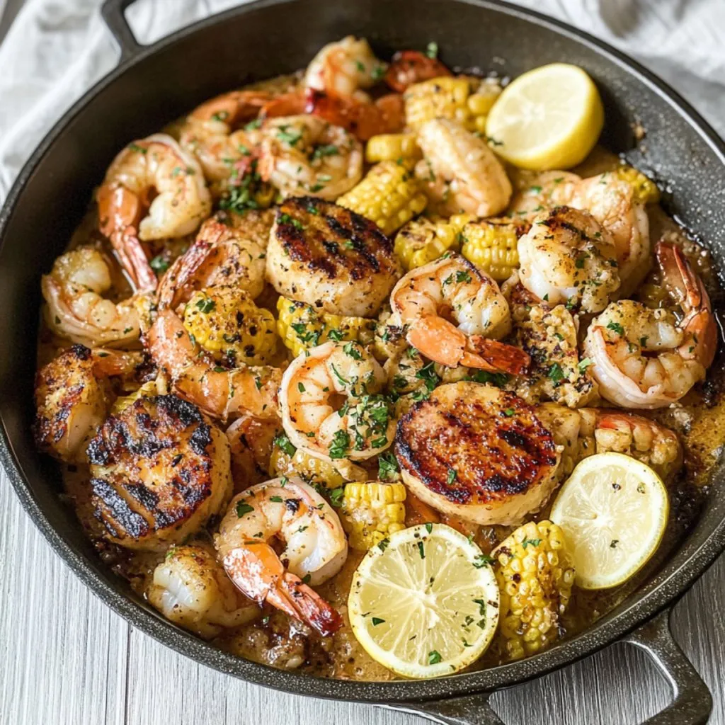 Ein sommerlicher Genuss vom Grill: Saftige Riesengarnelen, süßer Mais, zarte kleine Kartoffeln und würzige Wurst treffen sich in einer aromatischen Knoblauchbutter und werden perfekt gegrillt – gewürzt mit Old Bay für den klassischen Seafood-Geschmack.