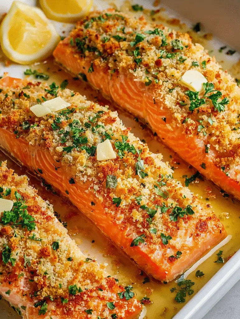 Dieses Gericht ist ein wahrer Genuss für alle Lachs-Liebhaber! Zarte Lachsfilets werden mit einer aromatischen Knoblauch-Butter-Kruste überzogen, die mit Panko-Semmelbröseln und frisch geriebenem Parmesan kombiniert wird. Inspiriert von den beliebten „Garlic Knots“ entsteht ein Gericht, das außen knusprig und innen saftig ist. Es ist schnell zubereitet, elegant präsentiert und eignet sich sowohl für ein schnelles Abendessen unter der Woche als auch für ein besonderes Menü mit Gästen.