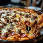Ein herzhafter Pasta-Auflauf voller Käse, Hackfleisch, Wurst, Bacon und Peperoni – die perfekte Verschmelzung von Pizza und Pasta für echte Fleischliebhaber.