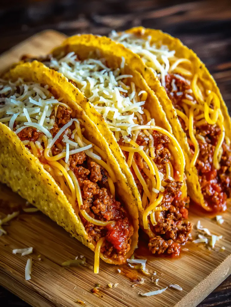 knusprige Taco-Schalen, gefüllt mit einer deftig-würzigen Mischung aus Spaghetti, Tomatensoße und Rinderhackfleisch – dazu geschmolzener Käse, der alles miteinander verbindet. Diese kreative Fusion bringt das Beste aus Pasta und Tex-Mex-Küche in einem spaßigen, sättigenden Gericht zusammen. Perfekt für Kinder, Familienabende oder wenn du Lust auf etwas Ungewöhnliches hast, das trotzdem schnell geht und richtig lecker ist.