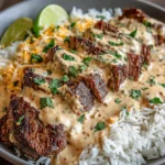Dieses herzhafte Gericht vereint zart gewürztes Steak mit einer selbstgemachten, cremigen Queso-Sauce, die über lockerem Langkornreis serviert wird. Jeder Bissen steckt voller Geschmack, und mit frischen Toppings wie Avocado, Koriander oder Limette bekommt das Ganze eine herrlich frische Tex-Mex-Note. Einfach genug für unter der Woche, aber trotzdem sättigend und besonders genug für Gäste. In weniger als einer Stunde auf dem Tisch – ein echtes Wohlfühlessen, das man immer wieder kochen möchte.