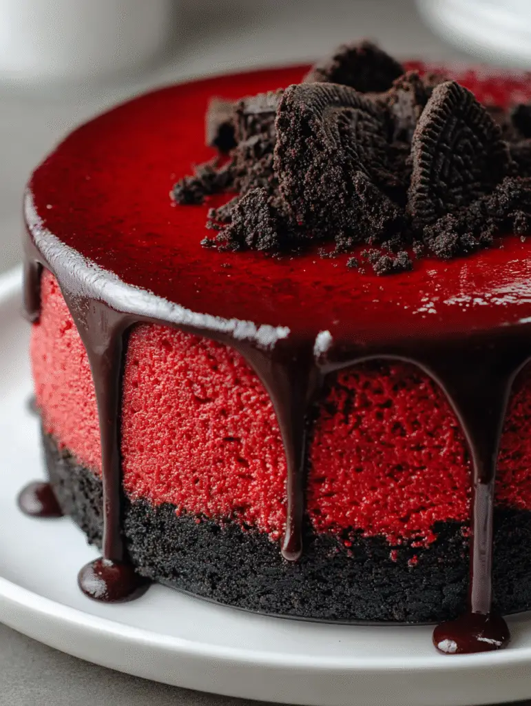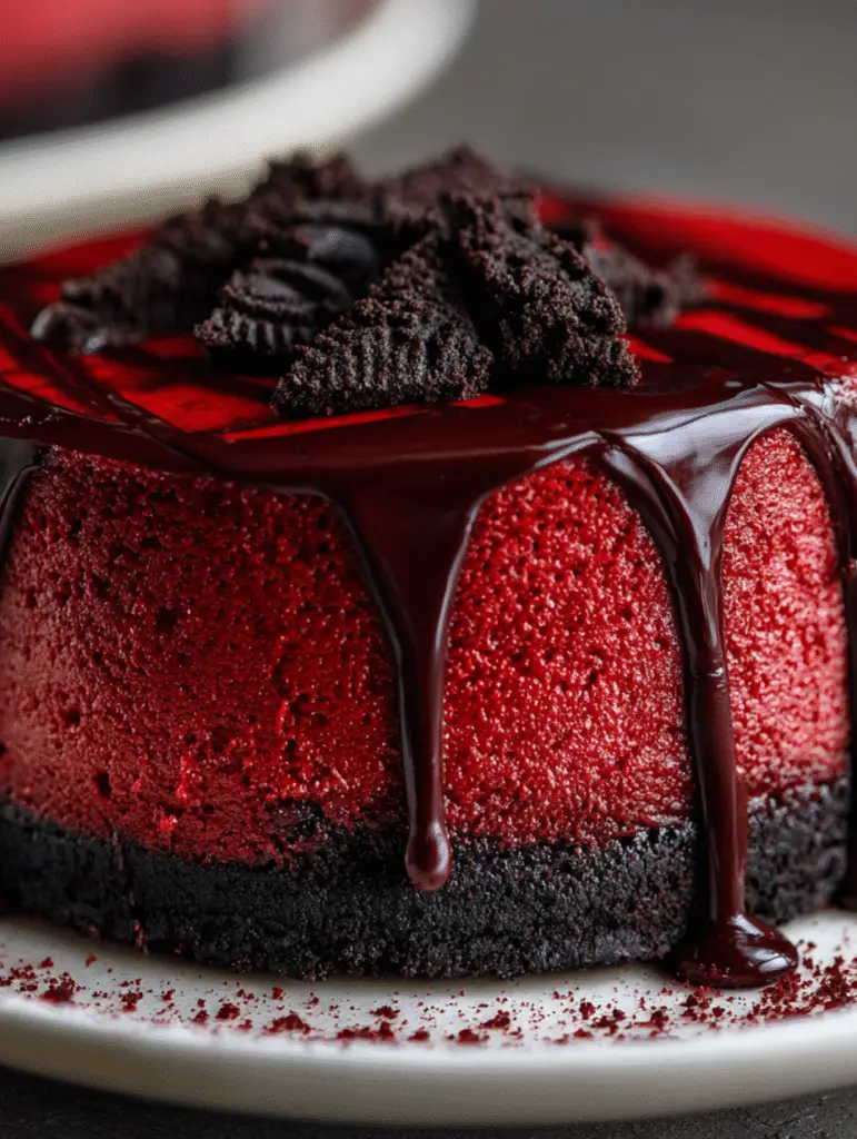 eine tiefrote Mittelton auf deinem Teller – samtiger Cheesecake, eingebettet in eine dunkle Schokoladen‑Keks‑Kruste, geträufelt mit einer „Blutspur“ aus Himbeersauce und gekrönt von dunkler Schokolade. Dieser „Vampire Bite Red Velvet Cheesecake“ ist nicht nur ein Dessert – er ist ein visuelles Erlebnis, ein Ereignis, das zugleich luxuriös und leicht unheimlich wirkt. Ideal für elegante Dinnerabende, Halloween‑Partys oder einfach dann, wenn du dir etwas ganz Besonderes gönnen willst.